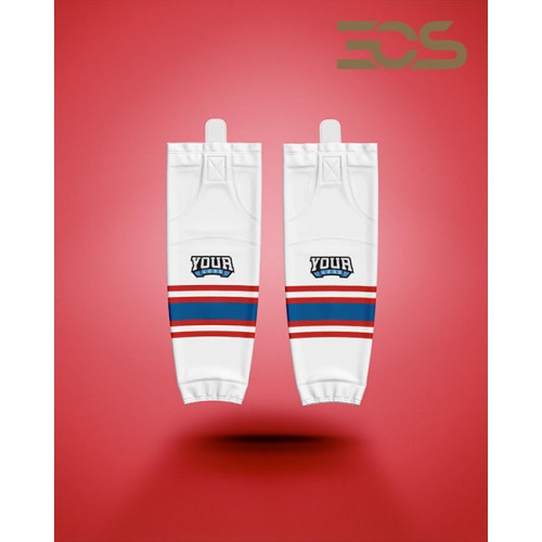 Design and customize your own hockey socks in your team colors and with your own logos. Sublimated with free design. With velcro at the top and strecth at the bottom.