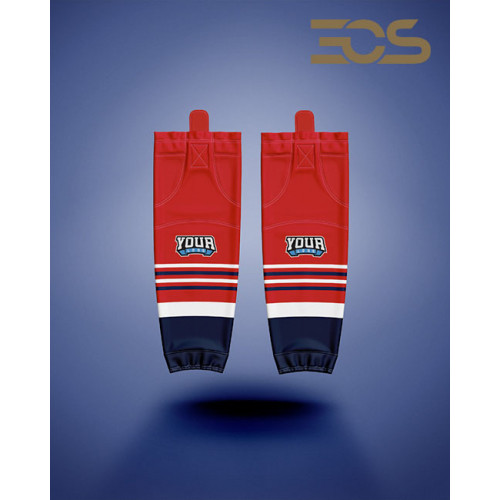 Design and customize your own hockey socks in your team colors and with your own logos. Sublimated with free design. With velcro at the top and strecth at the bottom.