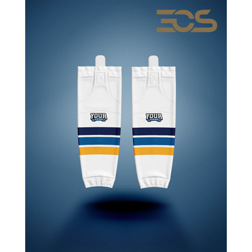 Design and customize your own hockey socks in your team colors and with your own logos. Sublimated with free design. With velcro at the top and strecth at the bottom.