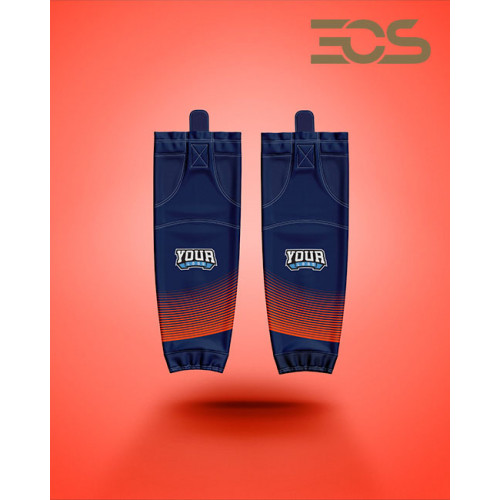 Design and customize your own hockey socks in your team colors and with your own logos. Sublimated base with sewn stripes. With velcro at the top and strecth at the bottom.