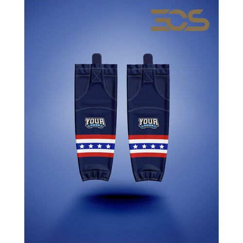Design and customize your own hockey socks in your team colors and with your own logos. Sublimated with free design. With velcro at the top and strecth at the bottom.