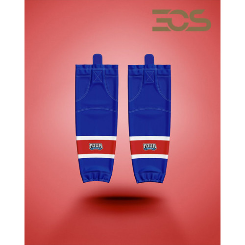 Design and customize your own hockey socks in your team colors and with your own logos. Sublimated base with sewn stripes. With velcro at the top and strecth at the bottom.